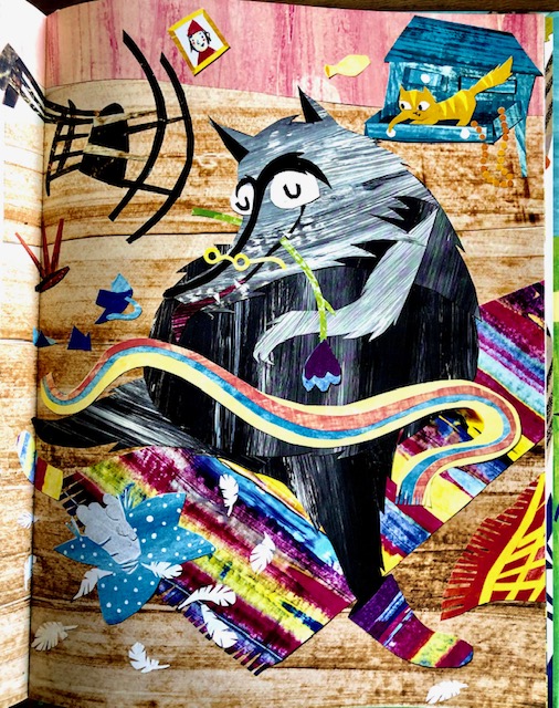 Katharina Naimer hat zunächst Bleistiftskizzen zu den Illustrationen angefertigt. Im weiteren Schritt färbt sie große Papierbahnen ein, die teils farbig sind. Kräftiges Gelb bereitet Felder und Wiesen vor. Auf braunem Papier entstehen Holzstrukturen. Verschiedene Grüntöne, mit groben Pinselstrichen bearbeitet, werden für Wiesen, Pflanzen und Bäume vorbereitet. Graues Papier, das mit borstigen Pinseln ausgearbeitet wird, benötigt sie für das Wolfsfell. Sind alle Papiere eingefärbt, geht es an die Collage. Aus vielen bunten Papierschnipseln setzen sich Hintergrund und Vordergrund zusammen. Stück für Stück entstehen so farbenprächtige Collagen, die sich sehen lassen können. Die Collagen bestechen in Farbpracht und Feinarbeit. Der Wolf erscheint als netter Geselle, im Größenverhältnis überdimensional groß zum Rotkäppchen. Das freundliche Wolfswesen, das sich einschmeichelt, bekommt leider kein Schurkengesicht, als er die Großmutter angeht und sich später dem Rotkäppchen als Großmutter präsentiert. Hier hätte ich mir ein bisschen mehr Boshaftigkeit gewünscht. In der Literatur zeigt der Antagonist irgendwann sein wahres Gesicht – hier bleibt er illustratorisch der nette Hund von nebenan. Freundlich, satt und zufrieden kommet er sich auf den letzten Bildern daher – bevor ihm der Garaus gemacht wird. Dem Leser tut er fast leid. Ein Rotkäppchen im klassischen Stil mit eindrucksvollen Grafiken. Ein Buch Bilderbuch für die Grimmsche Sammlung m Kinderzimmer.