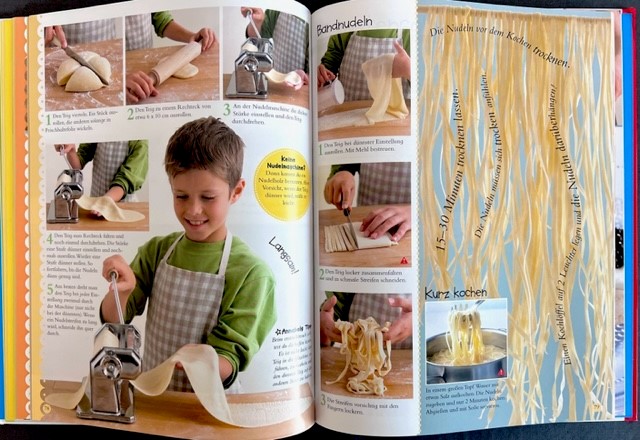 Zum Thema Fisch werden verschiedene Lachspäckchen, Fisch-Nuggets und Lachs im Teig vorgestellt. Burger, Pizza, Nudeln selbst gemacht und passende Soßen, Risotto, Gemüse-Lasagne (es wird die Zubereitung einer Bechermehlsoße im Prinzip erklärt, hier mit 4 Sorten Käse), – alles Gerichte, die Kindern schmecken. Am Ende folgt noch ein langes süßes Kapitel – das war mir zu lang, denn gerade Kinder sollten doch eher auf Süßes verzichten. Muffins, Möhrenkuchen, Marmorkuchen, Cupcakes, Brownies, Kekse, Müsliriegel – und dann endlich Obst! Apfel-Pastete und Obstörtchen, Beereneis. Am Zum Schluss geht es ums Vorbereiten von Zutaten – hätte das nicht an den Anfang gehört? Schneidetechniken, Tomaten häuten, Zitronenabrieb, Brühe, Herstellung von Semmelbrösel, würzen, Begriffe zum Backen. Aber die Techniken wurden bereits in den Rezepten erklärt – hier nochmal zusammenfassend kompakt als Grundlagenwissen.