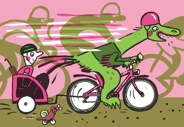 Dem Schriftsteller fällt gerade nichts ein, drum schwingt er sich auf sein Fahrrad. Er staunt nicht schlecht, als plötzlich so ein Urzeitreptil, eine Ciraptorin mit einer Fahrradklingel am Daumen auf der Straße steht und den Weg versperrt. Die schlagfertige Velorciraptorin möchte nämlich schneller werden, das Radfahren von ihm lernen. Na denn ... Der Literat schraubt seinen Beiwagen an, die Dame nimmt Platz und auf geht es. In 26 Kapiteln, von A wie «Aufpumpen» bis Z wie «Ziel» beginnt eine turbulente, witzige Reise, die mit einem Fahrradrennen endet. Das Urzeitreptil entpuppt sich als ganz schön frech und schlagfertig ...
